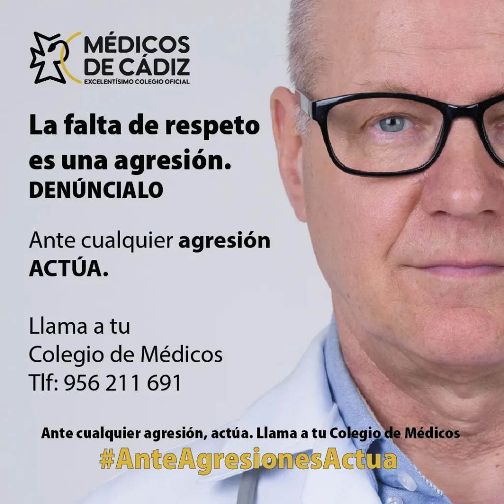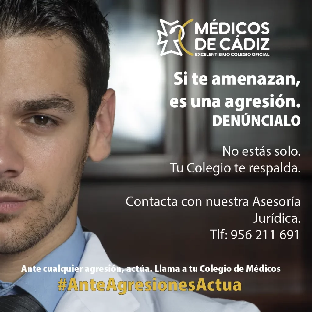 La violencia ejercida contra los médicos en el ejercicio de su labor asistencial comprende distintos niveles que van desde la agresión física hasta el insulto, el desprecio o la falta de respeto. Con el objetivo de que el profesional no normalice que cualquiera de estas manifestaciones son el efecto de un entorno crispado habitual y llegue a asumirlas como un atributo más de su actividad, el Colegio de Médicos de Cádiz (COMCADIZ) lanza la campaña ‘Ante agresiones, actúa’, dirigida al médico y que pone énfasis en el valor que su denuncia como víctima de una agresión adquiere para que el COMCADIZ ponga en marcha los mecanismos de defensa y, al mismo tiempo, de respaldo, acompañamiento y orientación desde su asesoría jurídica.