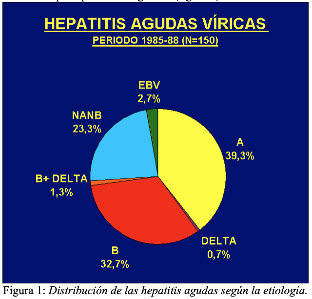 La incidencia de hepatitis víricas agudas en nuestra muestra global de 2.851 pacientes y con un seguimiento de tres años (de 1985 a 1988), fue del 5,26%, lo cual indica que dicha enfermedad era muy frecuente en aquella época en nuestro medio. La hepatitis A fue la primera en orden de frecuencia (39,3%), seguida de la B (32,7%) y de la No A No B (23,3%). Los demás tipos de hepatitis (mononucleósica, Delta, B más Delta) supusieron solamente el 4,7% del total.
