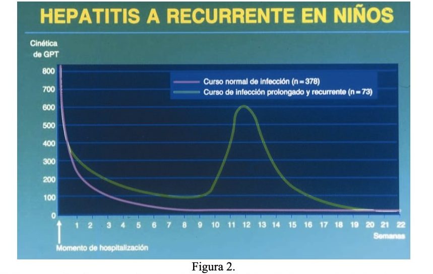 6.-Hepatitis aguda recurrente (o recidivante). Esta forma se caracteriza por uno o más episodios de elevación de aminotransferasas y/o ictericia después de una aparente recuperación de un episodio inicial de hepatitis aguda. Más común en la infección por VHA (figura 2), pero también descrita por VHB y VHE.