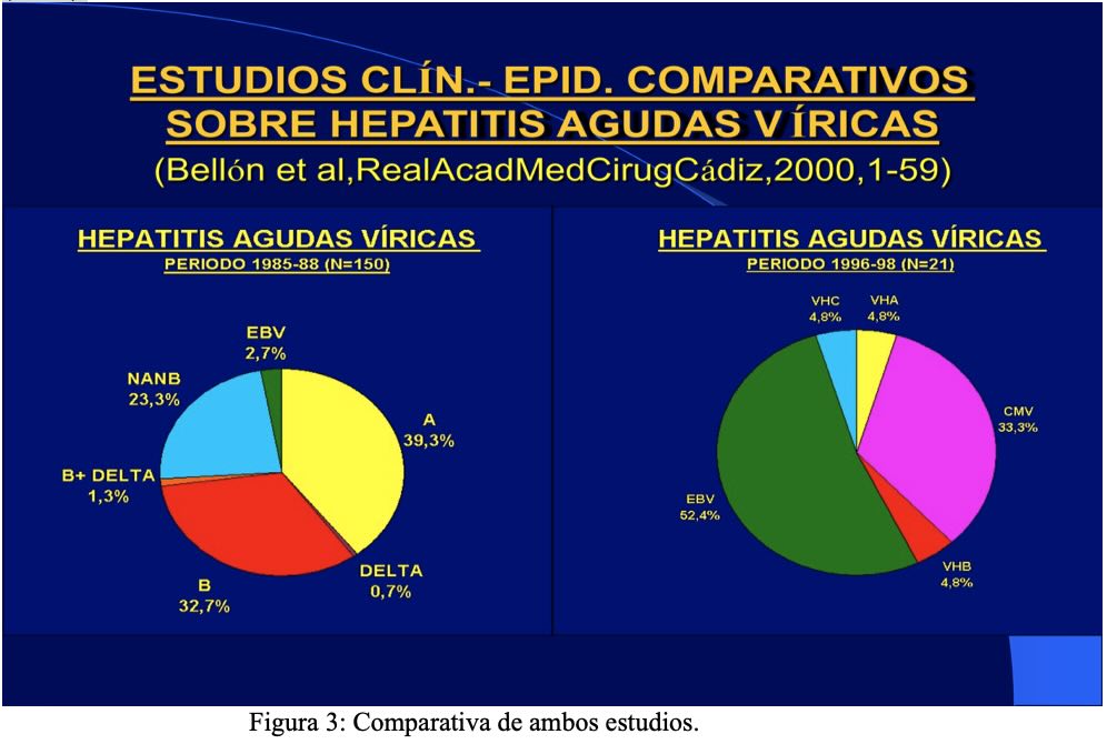 Como podemos observar en la siguiente gráfica, los factores etiológicos de ambos estudios diferían entre sí muy significativamente, pues mientras que en el primero existía un predominio casi exclusivo de las hepatitis por virus hepatotropos (A, B, Delta, No A No B) (97,33%; 146/150), en el segundo estudio predominaban (85,71%; 18/21) los virus sistémicos (virus de Epstein-Barr (VEB) y Citomegalovirus (CMV).