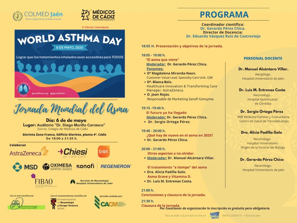 Con motivo del Día Mundial del Asma, que se celebra el próximo 6 de mayo, los colegios de médicos de Andalucía respaldarán esta conmemoración mediante la convocatoria de una jornada formativa bajo el lema: “El asma que viene”. Este encuentro, especialmente dirigido a médicos de familia, alergólogos, neumólogos, pediatras y asociaciones de pacientes, nace con una clara vocación multidisciplinar y expansiva, centrada en la actualización de conocimientos sobre el diagnóstico, manejo y tratamiento del asma, incorporando los últimos avances científicos y terapéuticos.